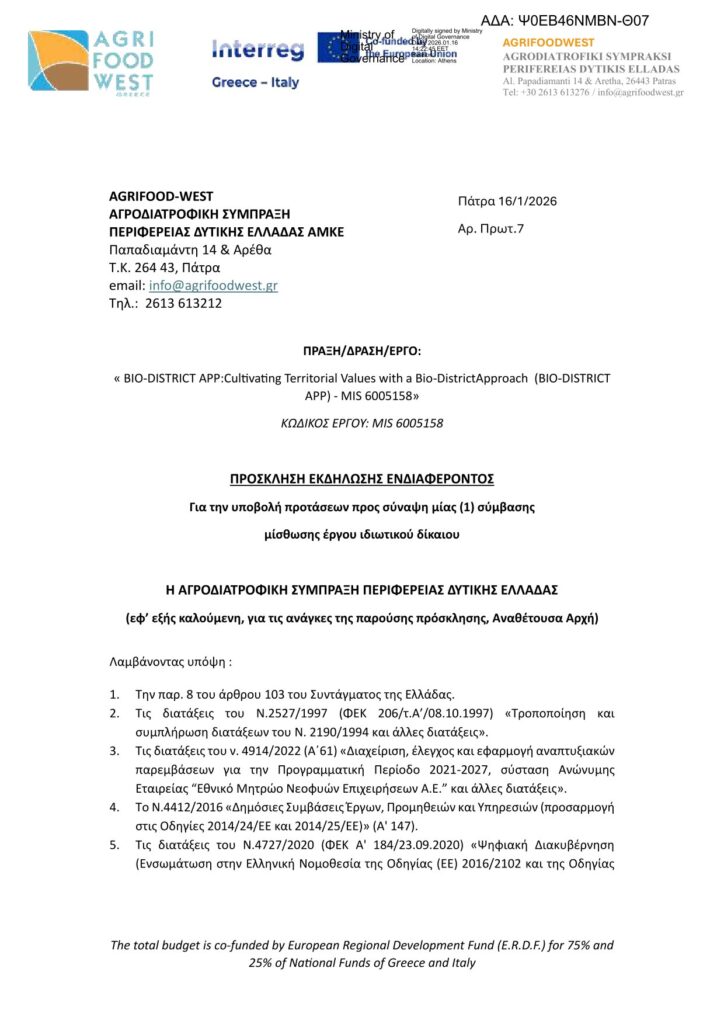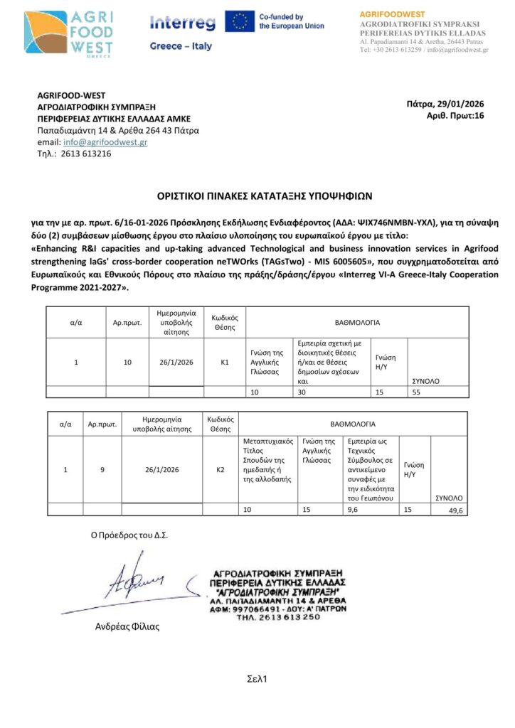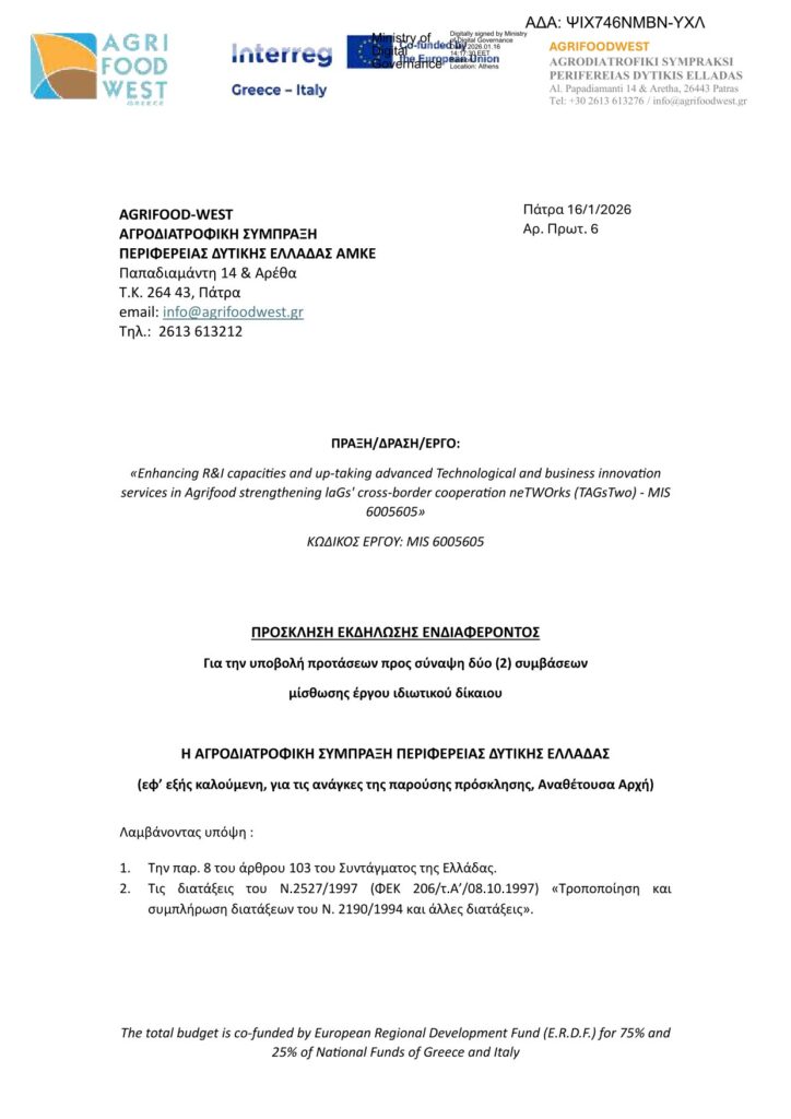 ΠΡΟΣΚΛΗΣΗ ΕΚΔΗΛΩΣΗΣ ΕΝΔΙΑΦΕΡΟΝΤΟΣ ΓΙΑ ΤΗ ΣΥΜΜΕΤΟΧΗ ΣΕ ΠΙΛΟΤΙΚΑ ΑΓΡΟΤΕΜΑΧΙΑ ΓΕΩΡΓΙΑΣ ΑΚΡΙΒΕΙΑΣ ΣΤΟ ΠΛΑΙΣΙΟ ΤΟΥ ΕΡΓΟΥ TAGsTwo – Interreg VI-A Ελλάδα – Ιταλία 2021-2027
